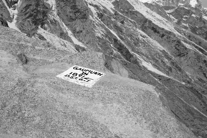 A stone inscription marking the position of Gaumukh in 1935 at about 17.5 km upstream of Gangotri town in Uttarkashi district, Uttarakhand