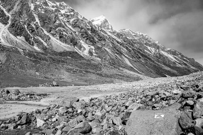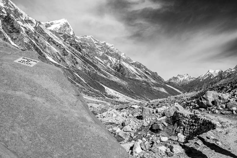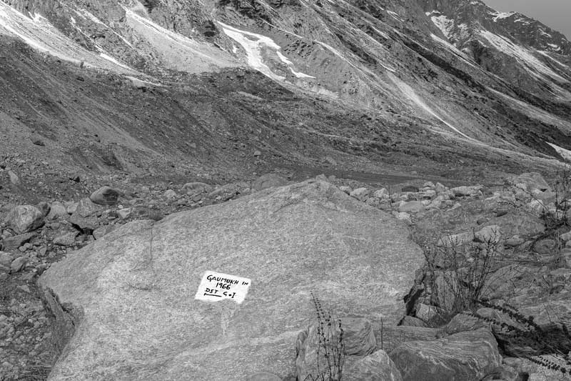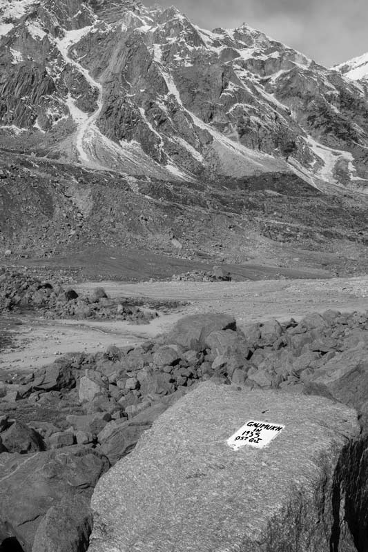 The position of Gaumukh in 1891, indicated by a stone inscription, located about 16 km upstream of Gangotri in Uttarkashi district, Uttarakhand
