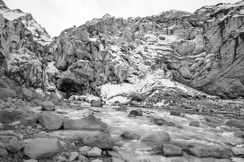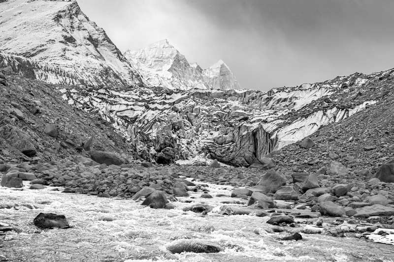 A view of the retreating Gangotri glacier along with Bhagirathi river at Gaumukh in Uttarkashi district, Uttarakhand