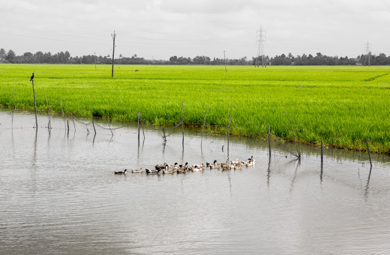 About one-third of the area of Kuttanad wetlands consists of paddy fields which have been reclaimed from the marshes and the lake bed. Blocks of paddy fields - called 'padshekharam' (or polders) - as shown in the photo above – have been created by raising double embankments with sluices all around for keeping the excess water of the wetland out or letting it in only when required. There are about 1,350 padshekharams in Kuttanad, where paddy cultivation is practiced as the economic mainstay by over 90,000 farmers. Starting in the 19th century with only one paddy crop in 2-3 years, over the last few decades, paddy has come to be cultivated intensively round the year in three cycles, namely Punja (November to March), Virruppu (mid-May to September) and Mundakan (September to December). This has had a deep impact upon the water resources of the wetland.