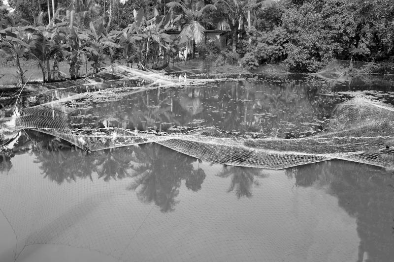 Inland fisheries is being undertaken in a large way in the Kuttanad wetlands. The farmed varieties include fin fish as well as shell fish, and besides specially created fish farms as shown the photo above, even paddy fields are leased out by farmers to fishermen for the purpose. Though a lucrative business, fish farming below the sea level comes with a heavy ecological price. Fertilizers and pesticides, along with other chemicals are added to enable thriving of the fish crop, and these in turn further deepen the problem of water quality degradation in the region.