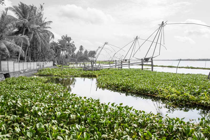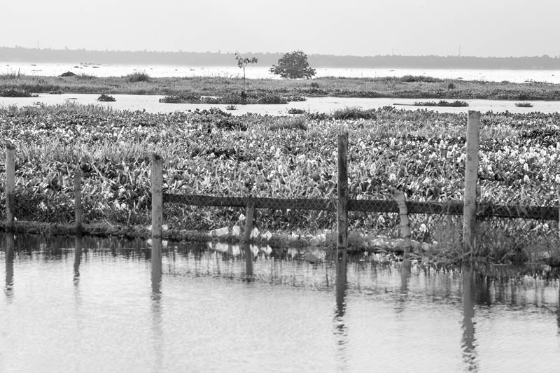 As noted before, the water of Vembanad Lake as well as the canals and streams in Kuttanad wetlands is very rich in nutrients, resulting from nutrient transport through agricultural runoff and untreated human waste sourced from the urban and rural settlements and the houseboats. Closure of Thanneermukkom Saltwater Barrier for extended periods is an important contributing factor too because this has led to significant reduction in tidal flushing in Kuttanad, which could have otherwise helped flush out the nutrients. As a result of eutrophication, alien invasive species like Kariba weed (Salvinia molesta) and water hyacinth (Eichhornia crassipes) have spread densely in the lake, canals and drains. These in turn impede water flows, prevent inland navigation, deplete dissolved oxygen and interfere with the entry of sunlight into water, thereby further adversely affecting fish reproduction and growth.
