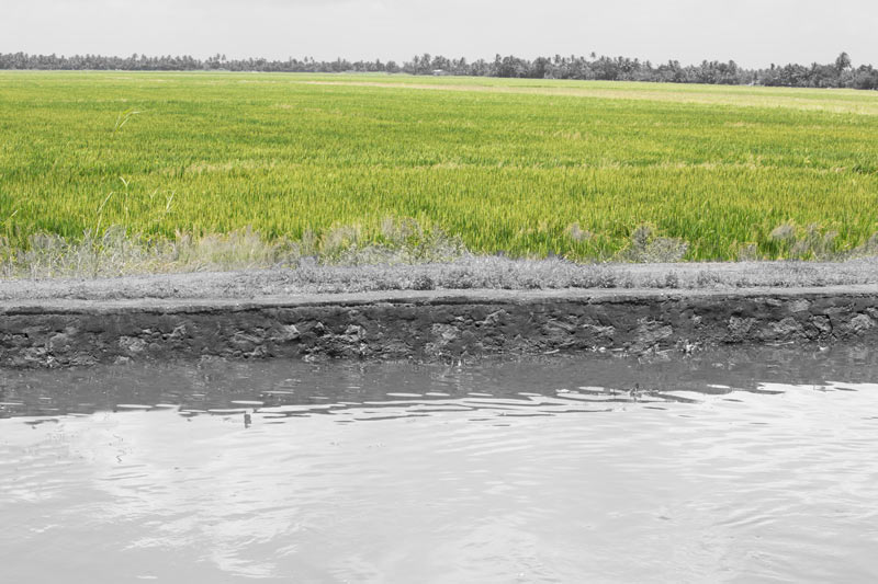 Paddy fields lying adjacent to a water canal in Alappuzha district, Kerala