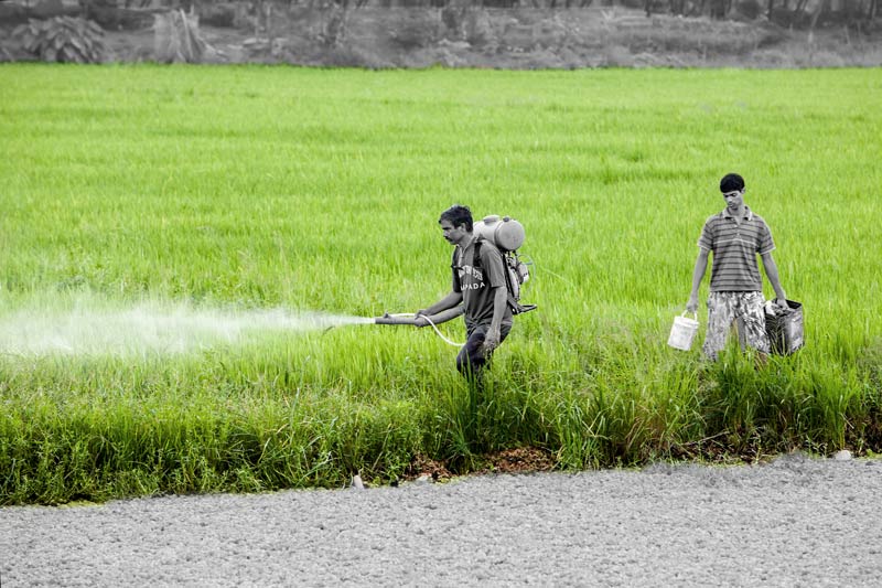 Pesticide being applied in paddy fields for enhancing productivity in Alappuzha district, Kerala