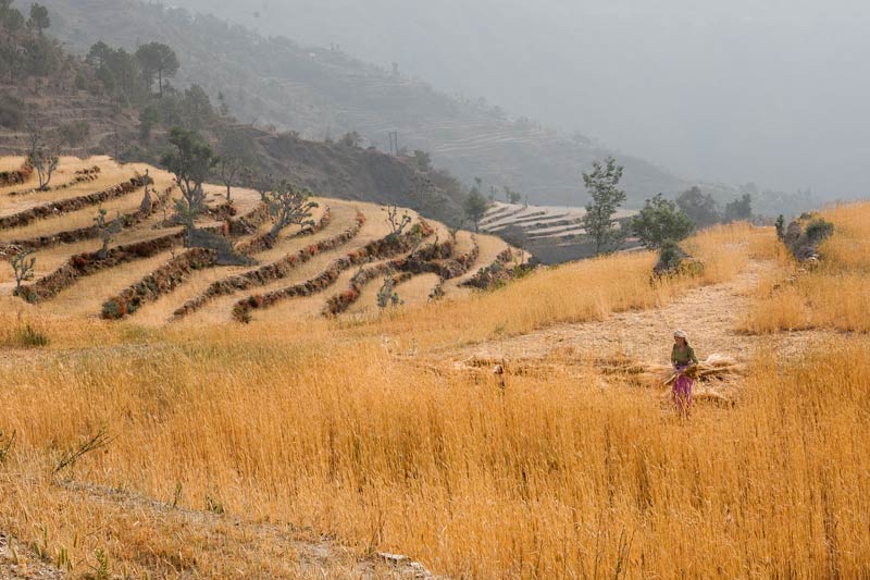Ripe wheat crop on terraces ready for harvest in district Tehri-Garhwal, Uttarakhand