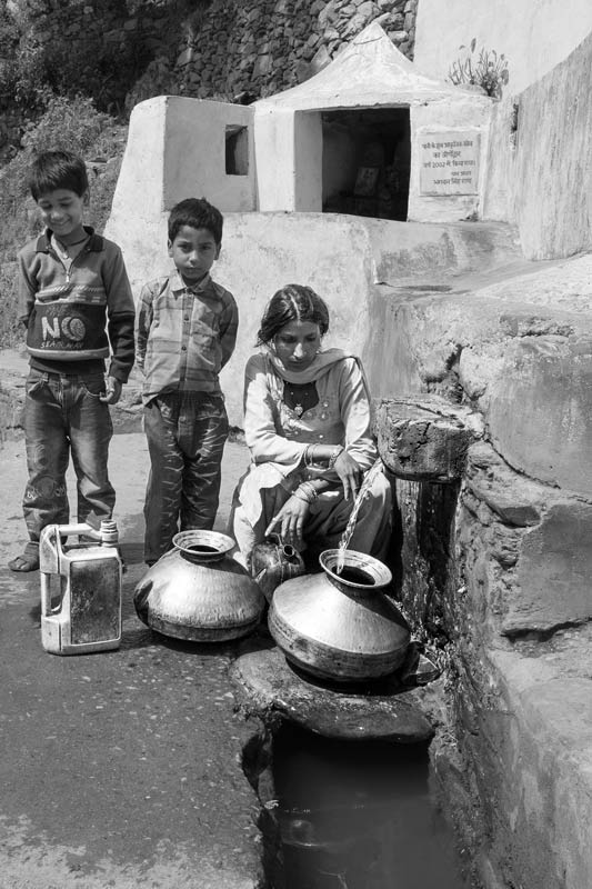 Streams fed by rain and meltwater from the snow and glaciers and springs emerging from fractures and fissures in the rocks nourish the Himalayan ecosystem and also provide water for human use. These supply water to the local hill communities for drinking and other domestic uses as well as for agriculture and other livelihood activities. In order to facilitate water collection from these mountain streams and springs, the water is channelized by fixing a small pipe into the rocky wall behind the water, as shown in the photo above. The resultant structure called 'gadera' is therefore in the form of an unprotected spring from where water can be collected for domestic use.
