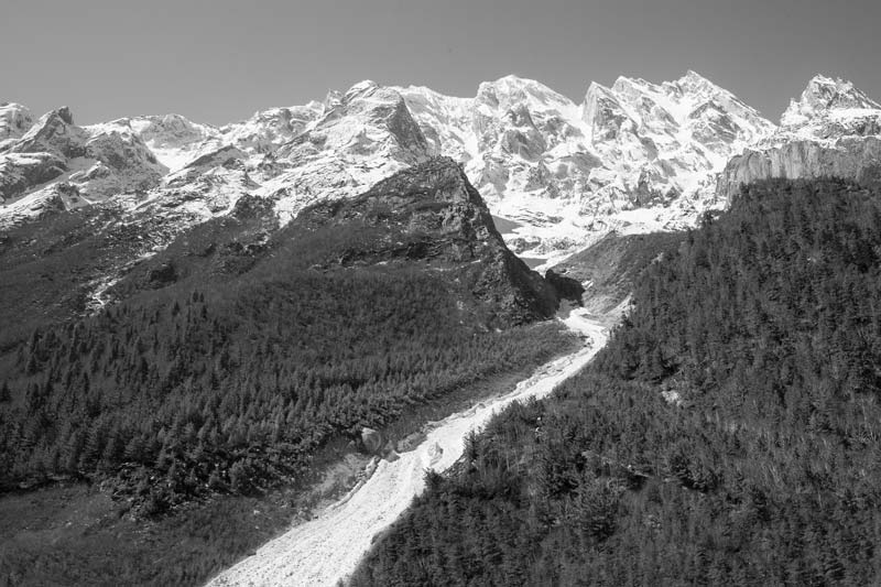 ‘Nature’ denotes the entire physical or material world around us, everything that is not human creation. It is commonly taken to include physical aspects like water, air, soil, mountains and valleys; biotic components like forests and animals; astronomical objects like the sun and planets; and even climatic phenomena like wind, clouds and precipitation. Water is a part of nature and is itself nurtured by it. Without nature, there would be no water. Initiated by the Sun’s warmth, and supported by nature’s green cover, nature helps recycle and redistribute water through the ‘water cycle’ that brings precipitation. Plants help in the process by adding to water vapor for cloud formation through evapo-transpiration from leaves. They also help by holding soil moisture which evaporates to add to the water vapor. Also, trees have been found to ‘sweat out’ organic molecules that react with compounds in the air to produce tiny particles that act as ‘cloud condensation nuclei’, thereby enabling cloud formation. Trees further create convection and turbulence in the atmosphere, which can facilitate precipitation. Most importantly, in the present context where global warming affects the water cycle in several ways, forests act as carbon-sinks that can help retard warming of the atmosphere at local as well as global scales. Mountains and hills play an important role in the water cycle by enabling precipitation directly through the orographic process where moist air is lifted along the slopes, making it cool rapidly, in turn causing cloud-formation and ultimately rainfall or snowfall. The water produced in the form of rain and snow eventually feeds glaciers, rivers, lakes and other surface water bodies, also enabling groundwater recharge. Nature also supports water in several other ways. For example, forests and vegetation help build up ‘green water’ storage in the soil which then infiltrates down to recharge groundwater aquifers. The role of nature in nurturing water is multifarious and varies across different kinds of ecosystems. Mountainous ecosystems are an important example that not only play a critical role in the water cycle, but also augment water resources in many ways, that in turn nourish nature and support societal development. This photo story aims to portray these vital relationships in the context of the Himalayas in India. The Himalayas are a 2,400 meters long mountain range spread across five countries of South Asia, with the largest area located in India. These mountains span across twelve states of India, namely, Jammu and Kashmir, Himachal Pradesh, Uttarakhand, Sikkim, West Bengal, Arunachal Pradesh, Assam, Tripura, Manipur, Mizoram, Nagaland and Meghalaya. In the Himalayas lies the source of three great river systems of India, namely, Indus, Ganga and Brahmaputra. In India, the mountain range itself is inhabited by more than 40 million people and the combined drainage basin of the three rivers nurtured by it is home to over 560 million people. This story is about the tale of ‘nature for water’ in the State of Uttarakhand where Ganga - the longest and holiest river of India - originates, and where rich water reserves are contained in several glaciers, lakes, rivers and streams. The title photo depicts river Bhagirathi – one of the headstreams of Ganga – meandering its way through valleys separating the high peaks of the Himalayas in Uttarkashi district, Uttarakhand.