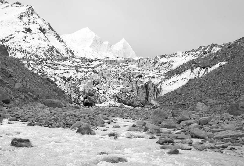 The Himalayas have more than 18,000 glaciers which are the source of the three great river systems of India, namely Ganga, Brahmaputra and Indus, and maintain a regular water supply in them during the dry season. The glaciers are fed by the rain and snow received from the Indian monsoon in the summer and western disturbances in the winter, with maximum snowfall occurring from December to March. Indian part of the Himalayas is home to 16,627 glaciers. Of these, 968 glaciers are located in Uttarakhand, of which Gangotri Glacier is the largest. This glacier extends between 4,120-7,000 meters above sea level, and is about 30 km long and 2-4 km wide. From the mouth of this glacier – called Gaumukh (literally, mouth of the cow), located near the base of Shivling peak – river Bhagirathi emerges, as shown in the above photo. Bhagirathi is one of the major tributaries of river Ganga.