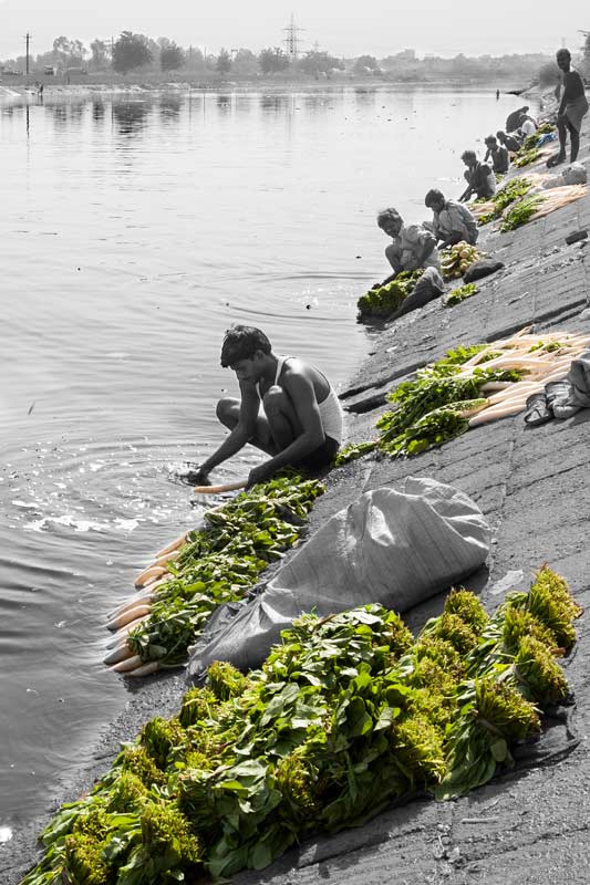 Washing spinach and radish for the market with predominantly untreated wastewater on the banks of Agra Canal in South-East district, National Capital Territory of Delhi