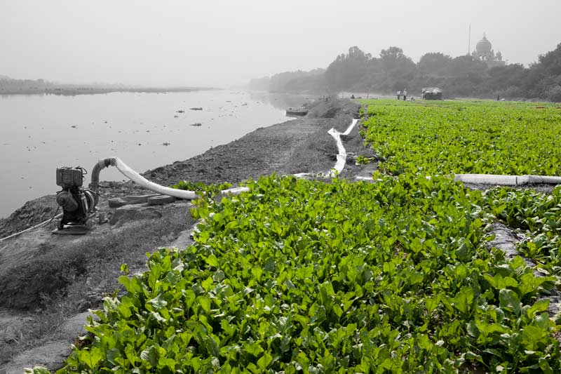 Irrigating spinach fields with wastewater drawn from river Yamuna in Central district, National Capital Territory of Delhi